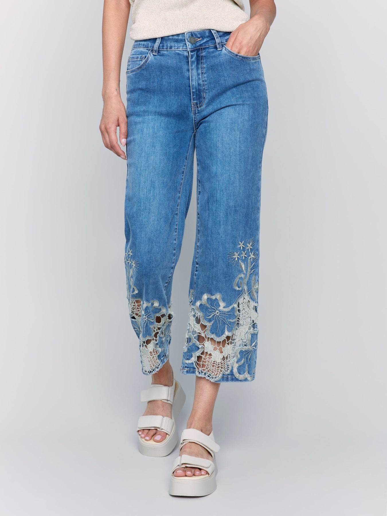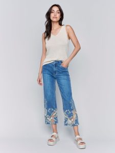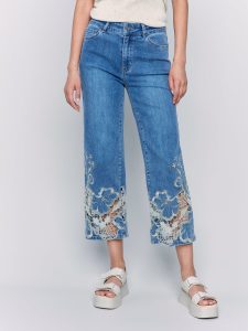 These Charlie B Lace Cut Trim Jeans feature a stunning gold embroidered hem, adding a touch of elegance to any outfit. With their intricate lace cut trim design, these jeans offer a unique and stylish look. Perfect for any occasion, these jeans will make you stand out in the best way possible.