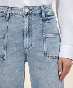 Patch pockets in a widened leg silhouette give a retro look designed is a high rise stretch denim.  Fabric: 94% Cotton, 5% Polyester, 1% SpandexSize u0026amp; Fit: Inseam: 31